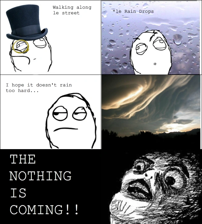 During 2020 somebody published a probably ironic Troll Physics comic revolving around covering oneself in oil to fly when it rains. This lead to an ironic resurgence of rage comics.