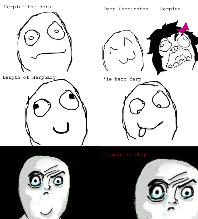 The "Derp" and "herp" are generally words used online to signify stupidity (see DERP). In rage comics, the words are used in two different ways. They can be used as placeholder expressions to unimportant dialogs or conditions but is also the name of a character who looks like an oblong circle with a face, usually a derp face, hence the name.